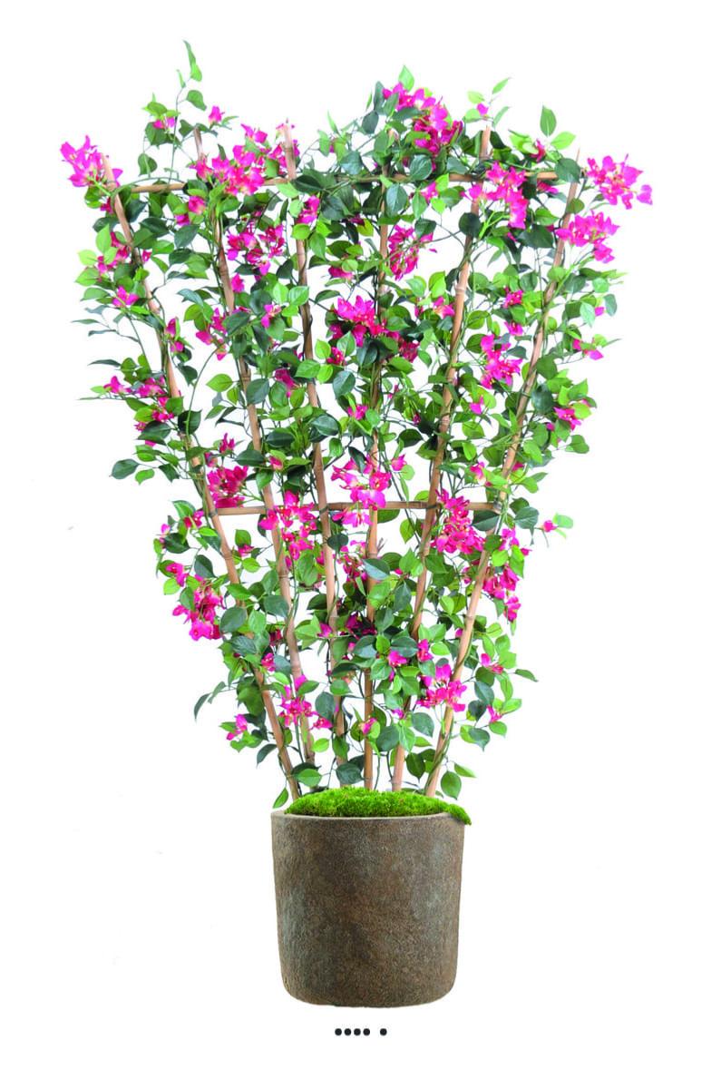 Bougainvillier sur palissade en pot avec ses jolies fleurs fuschia. Cet arbre mesure 130 cm de hauteur et 70 de largeur avec sa palissade 6 canes verticales et 2 horizontales. Nos arbres et nos plantes artificielles peuvent être traités anti-feu M1, n'hésitez pas à nous contacter pour plus de renseignements.